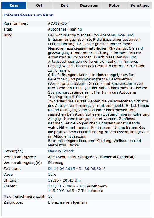 Als Dozent der Volkshochschule Rastatt, freue ich mich wieder zum Frühjahr-/ Sommersemester 2015, einen Kurs mit dem Thema Autogenes Training im Rahmen der Volkshochschule anbieten zu können. Der 10 Einheiten umfassende Kurs findet ab April in Bühlertal im Alten Schulhaus statt. Nähere Einzelheiten entnehmen Sie dem aktuellen VHS-Programm (siehe Auzug) oder unter www.vhs-rastatt.de. Anmeldung erfolgt über die Volkshochschule Rastatt. Es gelten deren Preise und AGBs.